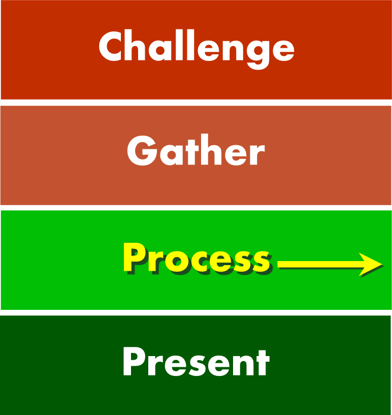 By using a suitable tool, the processing of data and information will naturally emerge from the gathering activities, e.g. a mindmap becomes an outline, a survey becomes spreadsheet data which can be queried, represented graphically and analysed. There are many technology tools for processing information. It is important to assess the potential for technology to enhance the various activities of the processing phase.